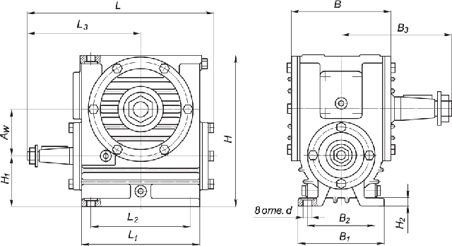 | Редуктор | Aw | B | B 1 | B 2 | B 3 | H | H 1 | H 2 | L | L 1 | L 2 | L 3 | d |